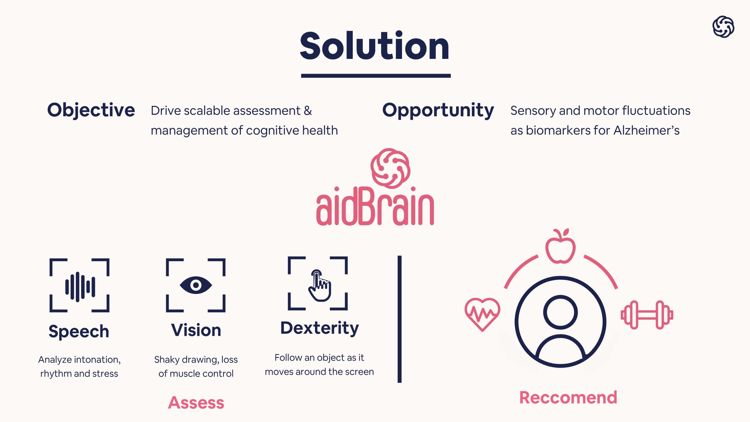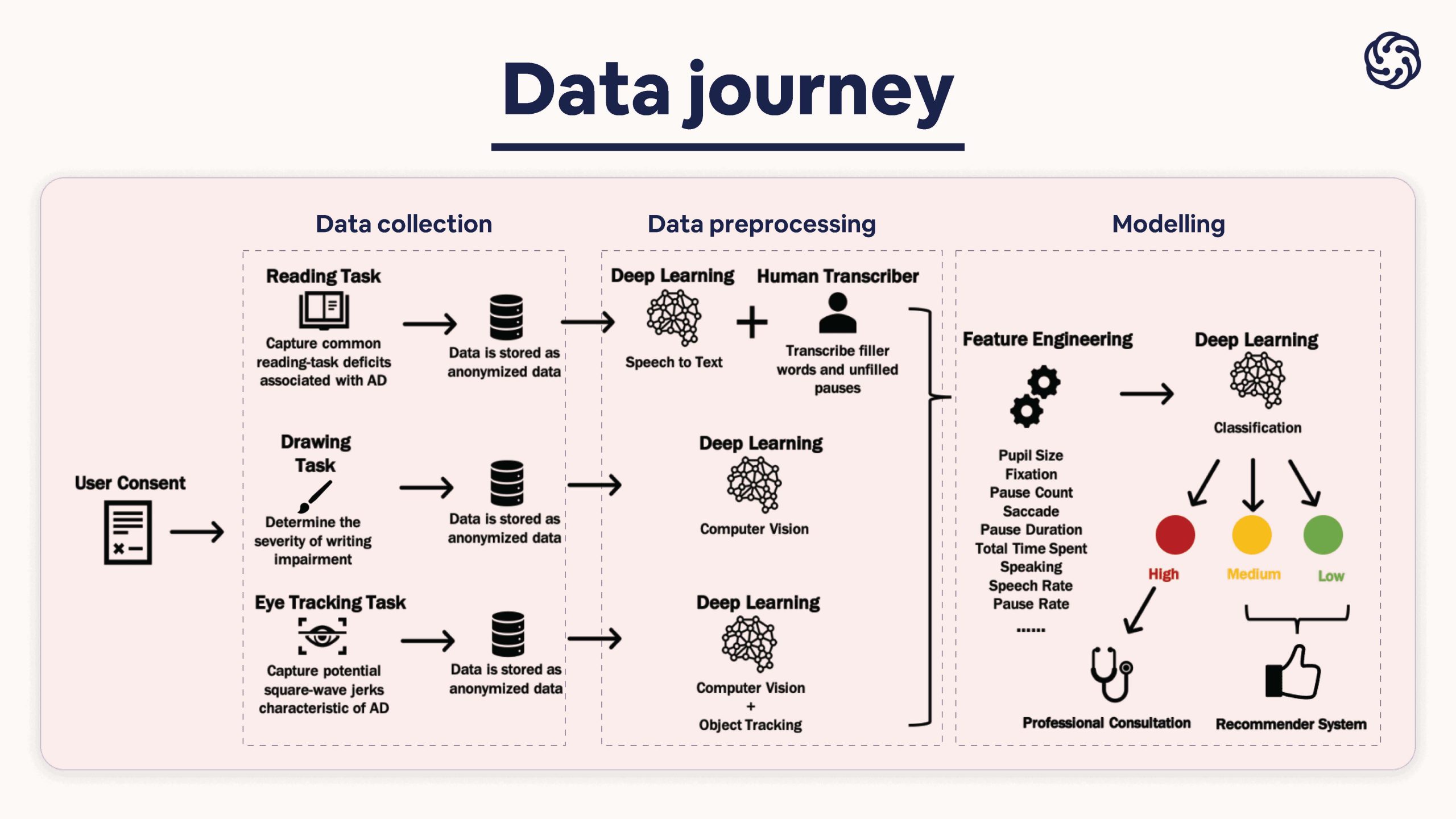•  AI-Powered Analysis: We envisioned leveraging machine learning, specifically deep learning technology to extract essential features from these multi-modal tasks. These features would then be fed into a classification model to generate a probability of Alzheimer’s risk.