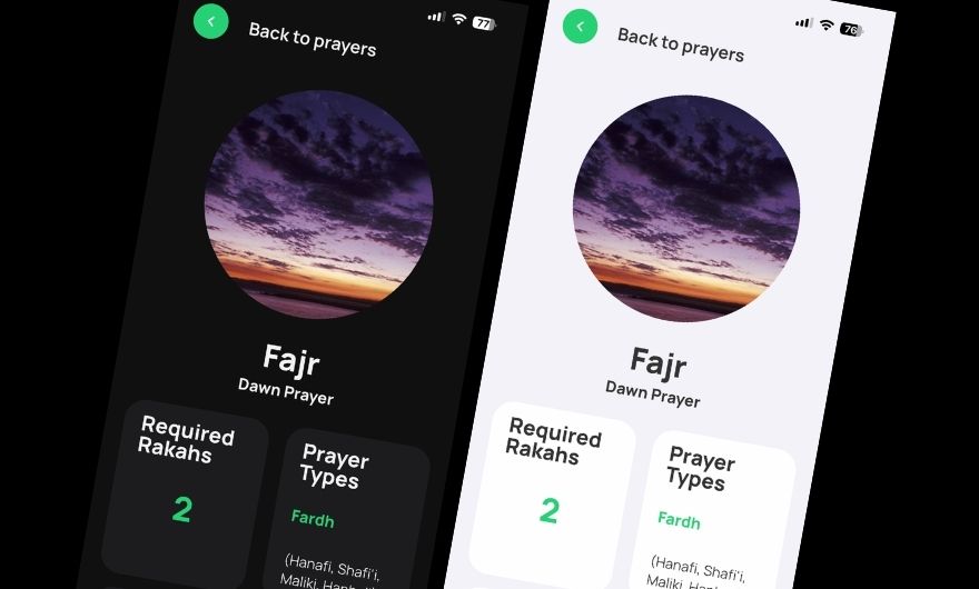 • Design Decisions: The app uses clean typography, ample spacing, and a neutral palette with support for dark and light modes to enhance usability in various contexts (e.g., during early morning or night prayers).