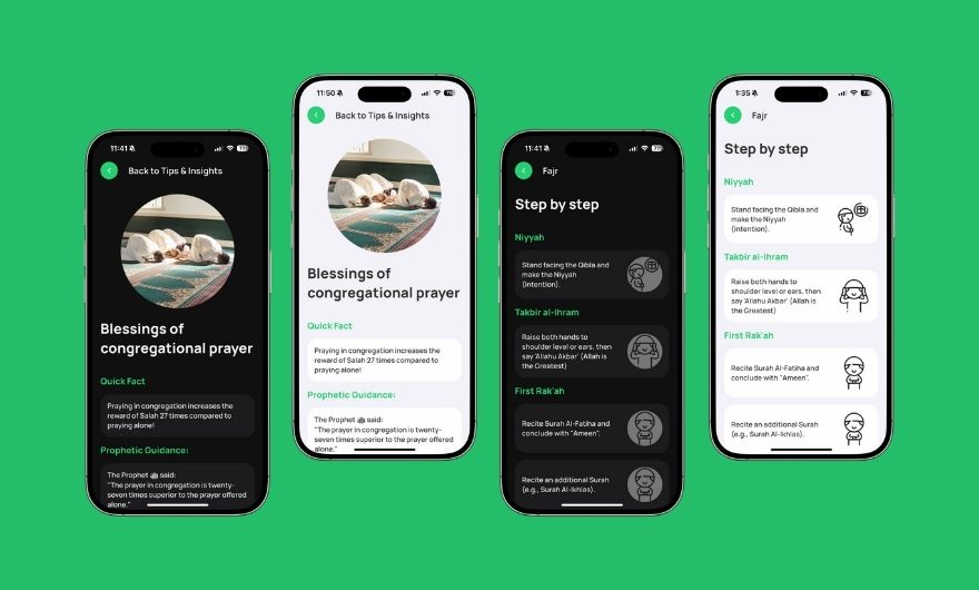 • User-Centered Approach: The project began with identifying pain points in existing Islamic apps, notably poor usability and outdated interfaces. My goal was to build a minimal, modern, and intuitive design to support both beginners and those seeking to improve their prayer.